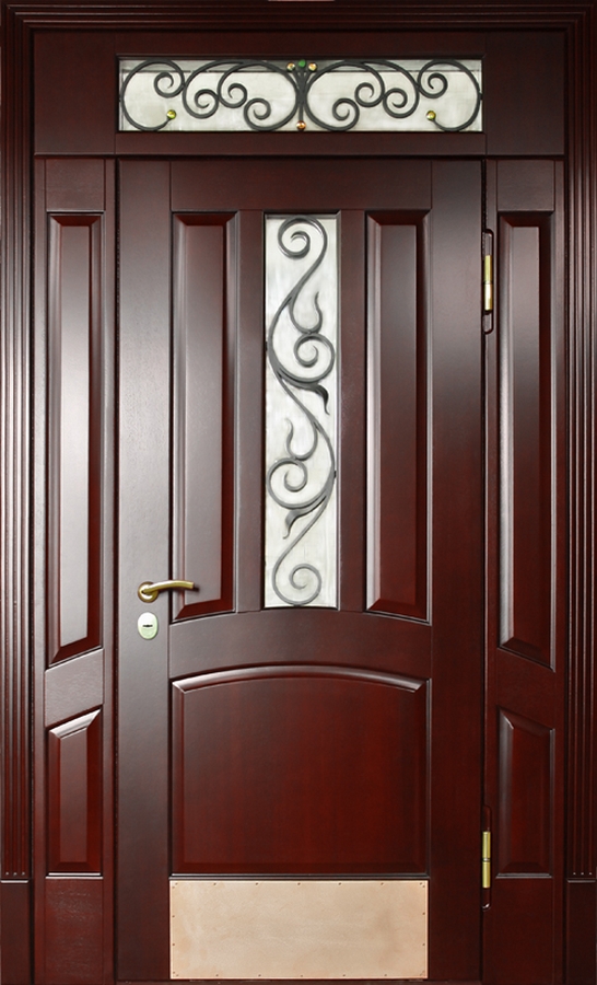 Красивая шпонированная дверь с надежной фурнитурой и ковкой "лоза" №33 идеально дополнит интерьер вашего частного дома или коттеджа. Внешняя и внутренняя отделка выполнены из натурального дерева, что придает двери элегантность и стиль. Профильная труба 50х25 мм используется для каркаса и полотна, а лист металла толщиной 2 мм и ребра жесткости из профильных труб 40х25 мм обеспечивают прочность и долговечность. Несмотря на отсутствие терморазрыва, дверь гарантирует надежную защиту и теплоизоляцию благодаря двум контурам уплотнения. Элементы ковки "лоза" придают двери особое очарование, сочетая практичность с эстетикой. Эта дверь — идеальный выбор для тех, кто ценит стиль, качество и безопасность. Красивая шпонированная дверь с надежной фурнитурой и ковкой "лоза" №33 от производителя: быстрое изготовление и монтаж в Апрелевке, индивидуальные размеры, широкий выбор материалов и фурнитуры, официальная гарантия до 10 лет.